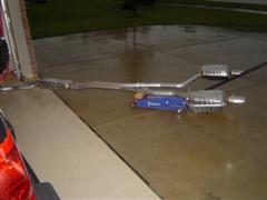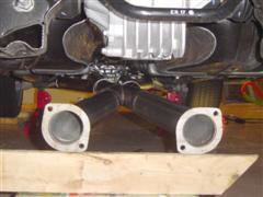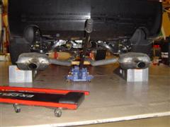 17. Support the rear of the x-pipe - I used a 12-pack of Dew and a 2x4 on edge. =) Use a 2x4 and a hammer to seat the x-pipe over the front pipes.