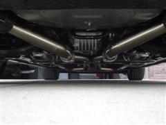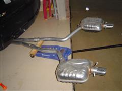 11. With the 3 rubber hangers removed on each muffler, slowly lower the floor jack. After the jack has been lowered all the way, finish removing the four front exhaust flange nuts.