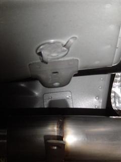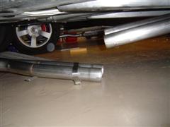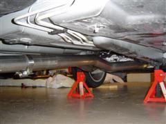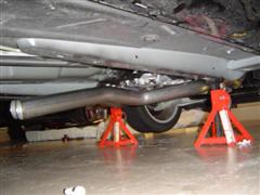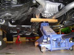12. If you've placed the 2x4 in the position shown, the factory exhaust will be perfectly balanced and can easily be rolled out from under the car with the floor jack.
