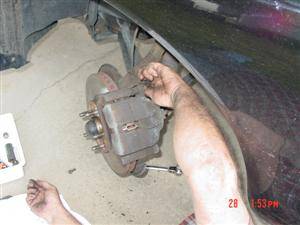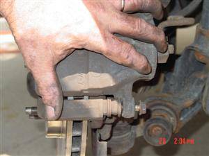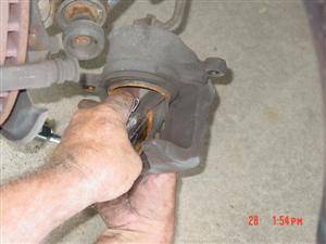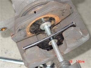 9. Remove the old pads. Raise the hood and open the cap on the brake fluid reservior so as to relieve the fluid pressure. Now place your caliper compression tool into the caliper using one of the old brake pads as a brace and compress the caliper. This is done to make room for the new, thicker pads. I like to now tie the caliper assembly to a part of the suspension to keep pressure off of the brake lines.