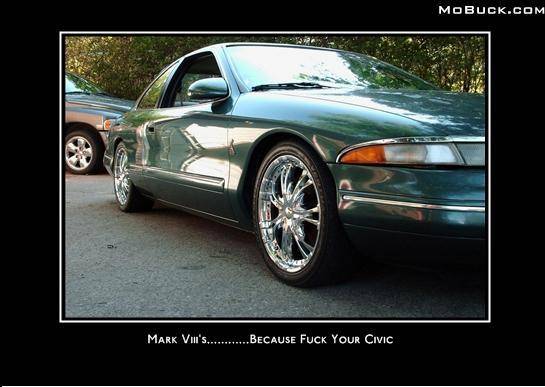this is my 95 Mark VIII. I Bought it for 3,500 cash in 2003 with 109,000 miles. It had already been converted to coils so no issues there. Before this I had a 93 Mark VIII that I sold to my brother, It is now 210,000 miles old. The 95 has been an excellent car, I resealed the transmission & replaced the antenna, Thats it. It's never left me anywhere. I already had the wheels from my 93, they're Wired 113's in a hard to find 18 X 8. it seems like everyone has the cobra wheels & i didn't want to blend into the background.mods to date are the 1.5" lowering springs. I shaved 2 inches off of the rear coils to make the car truly level.Modified air box with the holes & resonators removed. MSD 8.5 superconductors. 2.5" Exhaust with X pipe from ART.I put the included Borla's on my 93 before selling it so the 95 is wide open & my neighbors hate my guts.(this was all a long time ago.) more recent mods include the screamin demon coil packs, K&N panel filter(NOT a big fan of the cones w/ no heat protection.)All of the airbox tricks have been done to it. J'modded trans with external in line tranny cooler.AWSF22C's. Finally found an affordable 99 cobra center & installed it last year. NO wheel hop thanks to new Diff bushings & the BIG addco rear sway bar. I also have the 180 thermostat with a 4 position SCT switch chip, #0= 93 octane with firmer shifts, no speed limiter, lowered cooling fan temp & lowered idle to 550-600 RPM.#2=87 octane w/same setup. #3=valet mode, factory settings with speed limiter set at 40 MPH. (for my a$$hole brother when he needs to borrow it:)