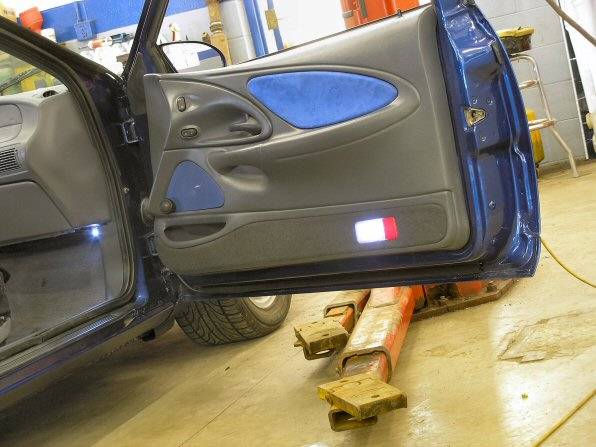 ok well on Saturday, after 2 hours of digging/pushing the car out of the driveway i got to the shop. MWB had all the wheel liners and all the little pieces installed in the back. we got the fog lights mounted, the front wheel wells installed, i threw on the finished door panels and installed a auto down relay thingie (something he found on tccoa) from a taurus, talk about cake, 5 wires and once i got my test light fixed we were all good. only a couple pics cuz who wants to see a wheel liner anyways? and just to note (since its been mentioned on one of his thread on tccoa) the leather inserts in the door panels actually matches the car and is not highlighter blue like it looks in the pics, even without flash its still bright as hell