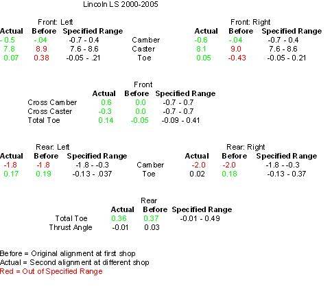 Ok everyone, drove the heck out of the car so the suspension would settle. Took it to a real alignment shop and everything is right on. Of course the rear is still barely out of limits but they said that's normal for the LS. The original shop had the Toe wrong but it's now fixed. All I can say is I love how the car corners and so far the drop hasn't resulted in too many scrapes. I'll try to take pics today.