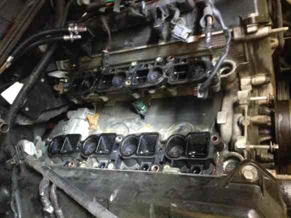 Valve covers and Spark Plugs are done. Have to get a new ignition coil. One of them were broken. How I did not have a miss is beyond me. The passenger side was leaking really bad. The spark plug socket was soaked in oil. Heads were pretty clean.