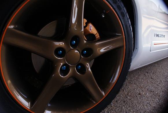 Its more like a brown color. My dad custom mixed it and I liked it,but wanted to contrast the gold/orange pearl in the car with the wheels a bit more. So the stripe was added and I liked the blue nutz so I left them on. The molding where the chrome went was flaking,and orange electrical tape went on it,I really liked the way everything played together. Along with the gold calipers