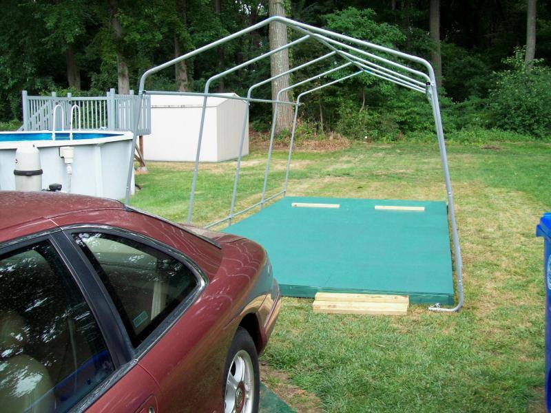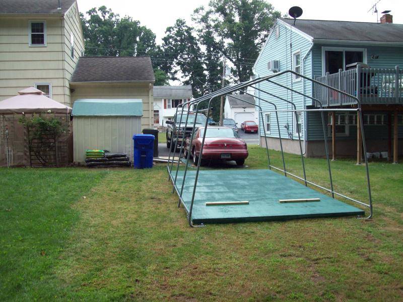 Floor is 2X4 pressure treated, with 3/4" plywood sitting on 3 mil plastic. Primed and painted with ( RESTORE new kind of paint w/ sand in it ). Car port has open sides, this has all sides covered. The framing seems real strong. Can't figure where to place the poles for the dancers. Got the garage on sale for $219. reg=279. $300. for the floor. Costly but it'll keep the crap off one car and less lawn to mow I should get it finished next week.
