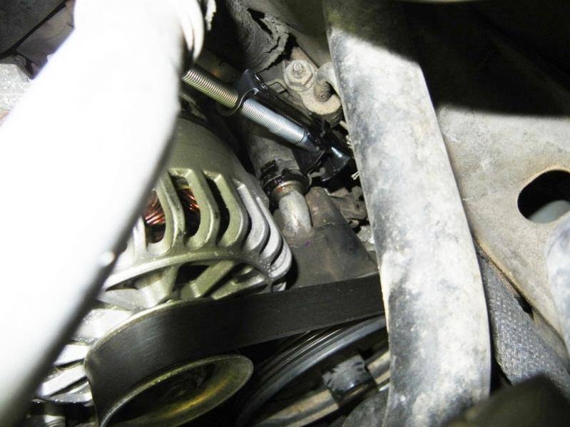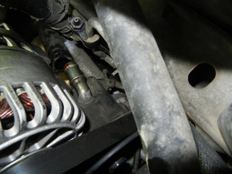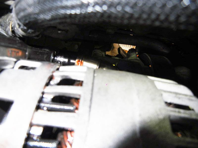 Crawl under car and locate your alternator near the passenger side tire (i had removed my plastic shields on a previous job), my alternator has a big terminal and 0g wire coming off it going directly to the battery, I have a big sound system and it isn't worth removing to disconnect the battery. That terminal and post/nut is HOT, careful shorting anything to it. The hose to the right of that is from the reservoir leading to pump hose.