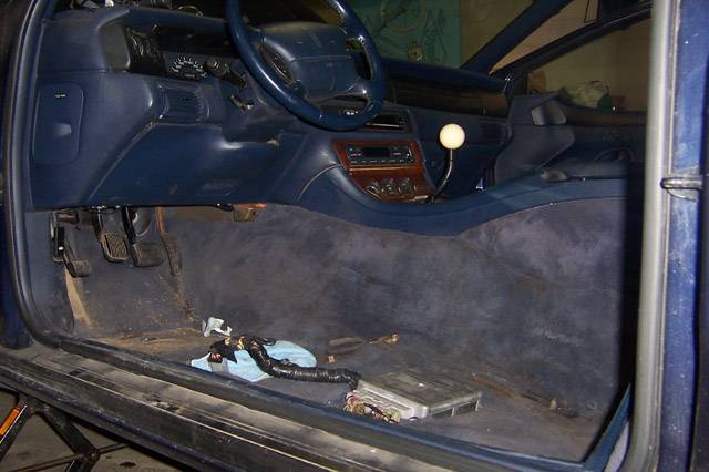 To fit the clutch pedal in, you have to move the ECM out from under the dash. I chose to mount it under the drivers seat, but am regretting it now. My 95 will get is ECM moved to the back electronics rack in the trunk. ALOT safer back there than under a seat that moves back and forth everytime someone gets in. The wiring harness has to be extended to reach to the new location, and for mine, required 850 feet of 18 gauge wire, 130 solder joints, and a few 25 pin D-Sub connector pairs. Pics also. (This is the most time consuming part of the job, except waiting for that beautiful new MMX driveshaft.)