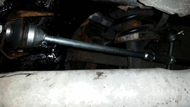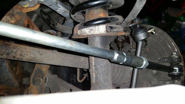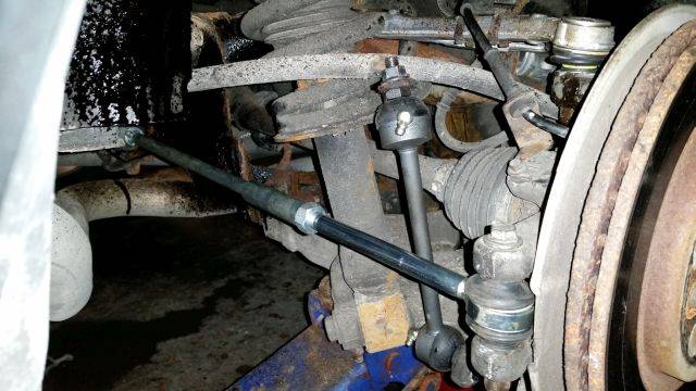 All in all, went in ok, no hardware put up a fight coming out. Did have to file out the wheel side pivot link on the JAG aftermarket toe adjust linkages to get the long bolt to pass through.