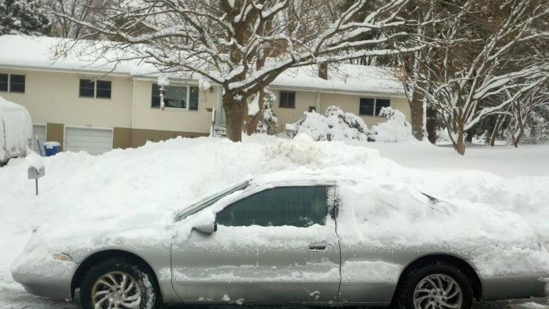 It was driven in snow. I expected the worst and I guess I'm pleased. Handles very much like my 98 marquis did, which isn't all that great. We only had about 2.5" on the ground by the time I left work so the roads weren't THAT bad. Took a bit to get going from a complete stop but once moving it wasn't all that bad, I was getting passed alot though. If we get an actual blizzard I'll be up it's creek. :(