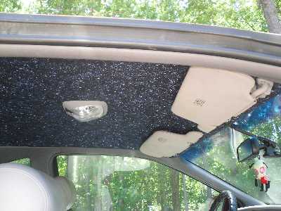 Yesterday, I removed my tore-up headliner and re-covered it. This morning I re-installed it. Since I'm broke and can't afford to send the car out to an upholstery shop, I did it myself. It actually turned out pretty good. I decided to be "different" and go with something other than just plain ol' grey. My wife and I went to the fabric section at Wal-Mart and she picked this pattern out. It's a starry night style. So when you look up at the ceiling, you see stars. Pretty cool.